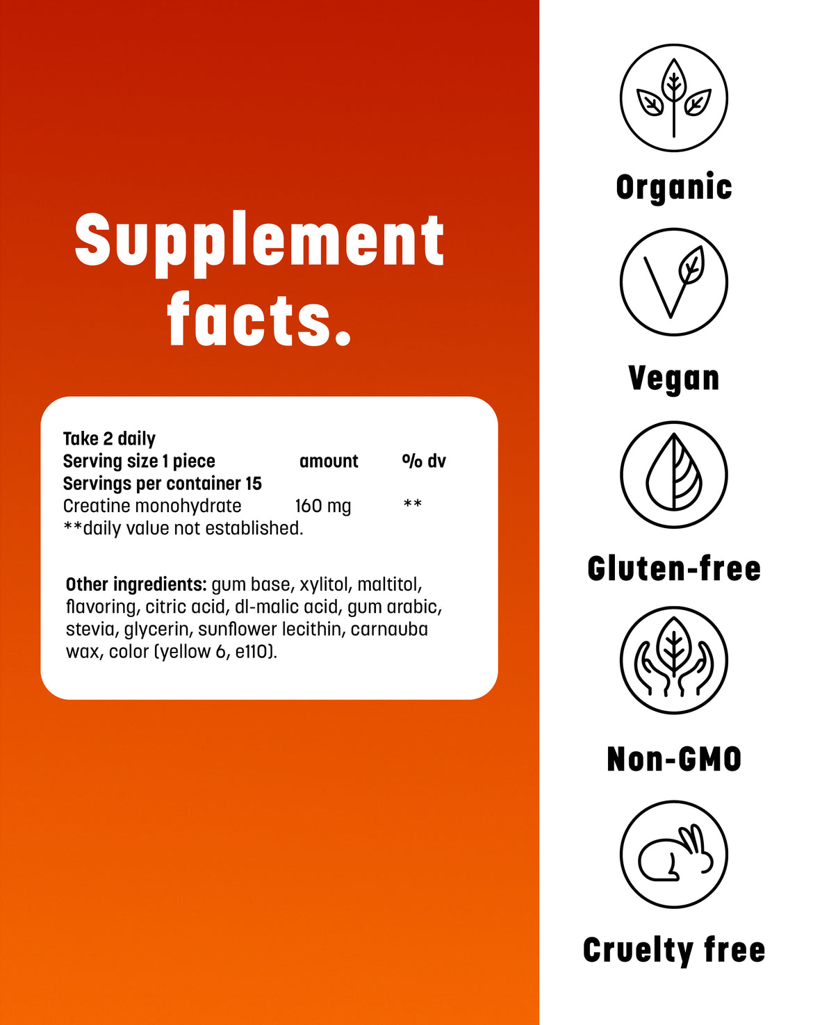 With every chew, you give your body a simple way to supplement creatine, helping fuel your training and support your fitness goals wherever you are.