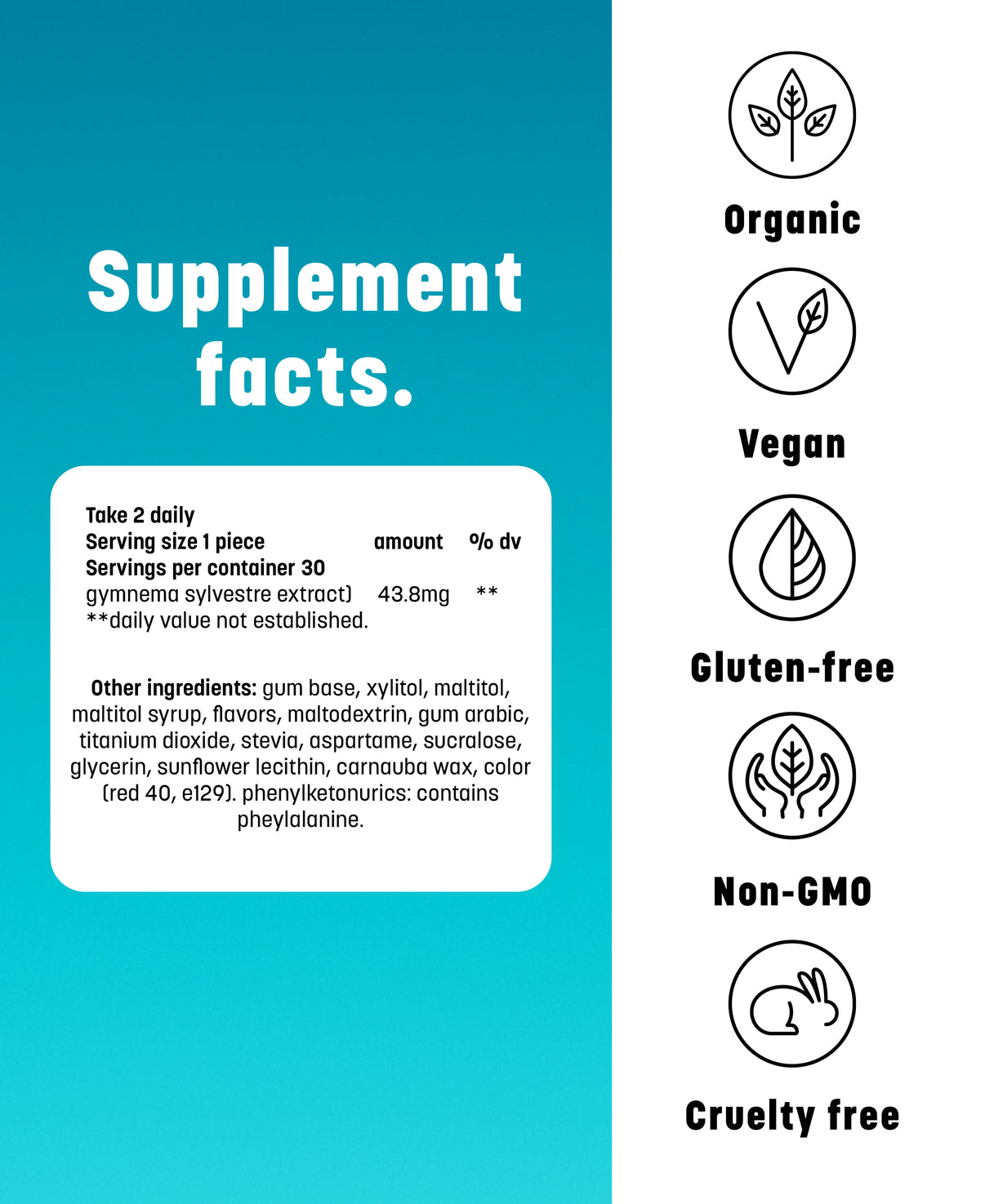 Other Ingredients: Gum Base, Xylitol, Maltitol, Maltitol Syrup, Flavors, Maltodextrin, Gum Arabic, Titanium Dioxide, Stevia, Aspartame, Sucralose, Glycerin, Sunflower Lecithin, Carnauba Wax, Color (Red 40, E129). Phenylketonurics: Contains Pheylalanine.